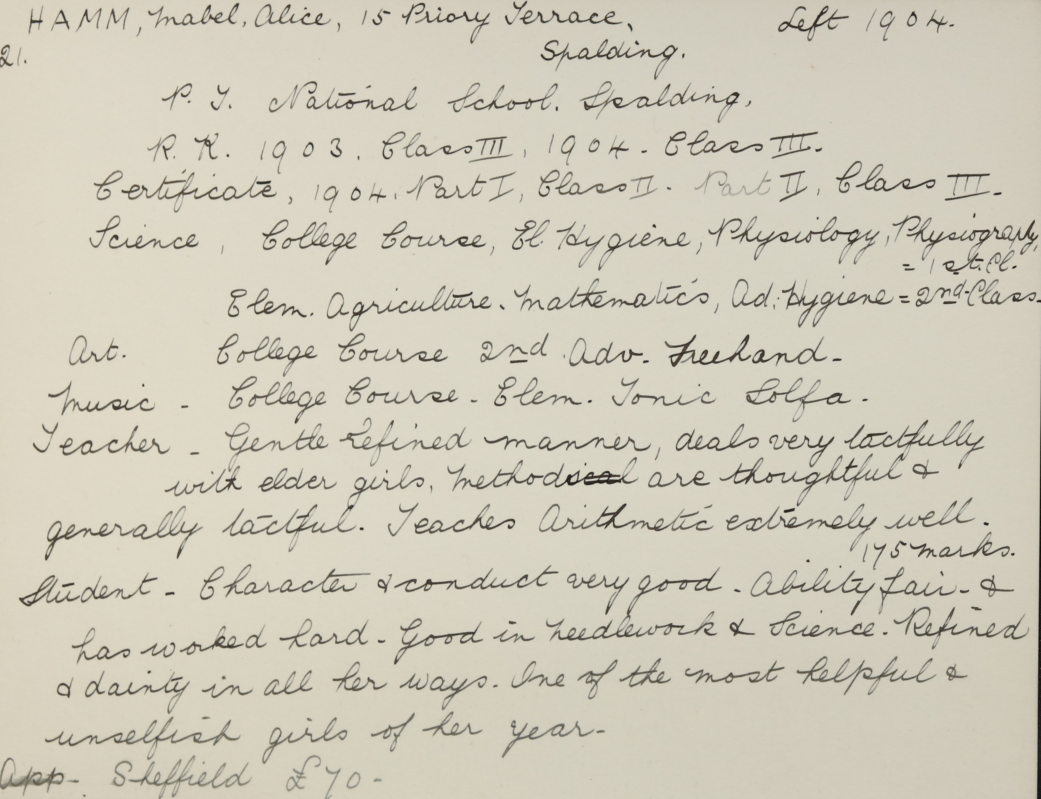 She is at 15 Priory Road, Spalding. Her aunt, Louisa Ann Hamm (b. 1848), is listed as ‘Retired Elementary Head Mistress’. Mabel is listed as ‘Retired Elementary Assistant Mistress’. Her mother is unlisted.