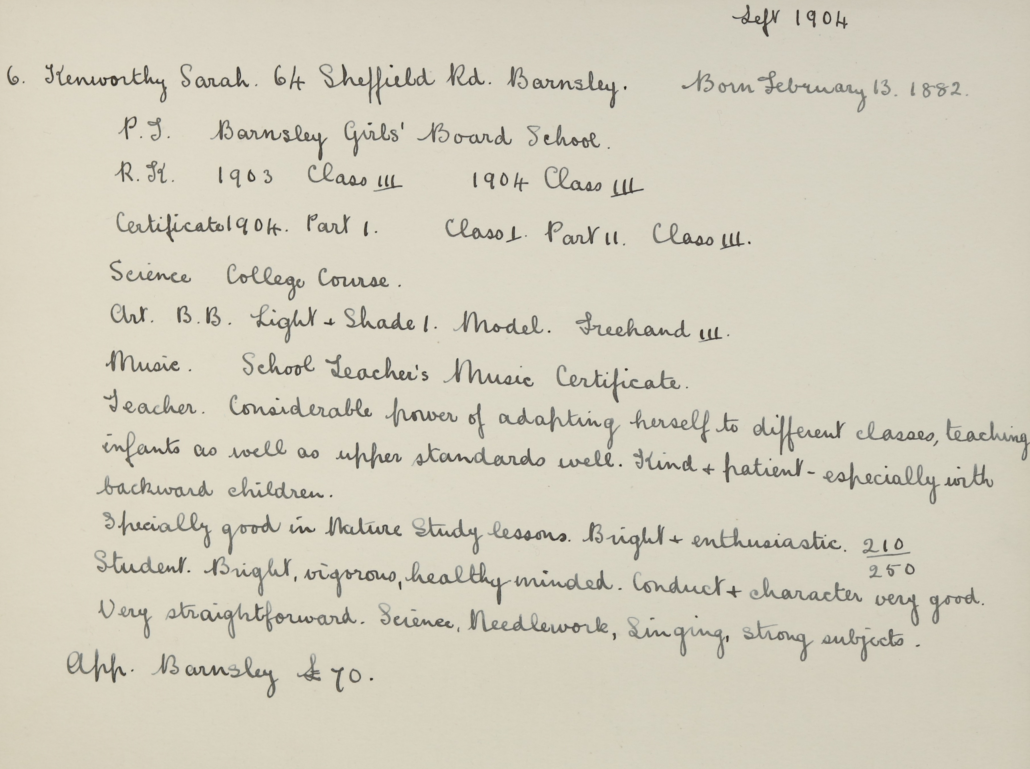 Address is 104 Sheffield Road, Barnsley, Yorks.