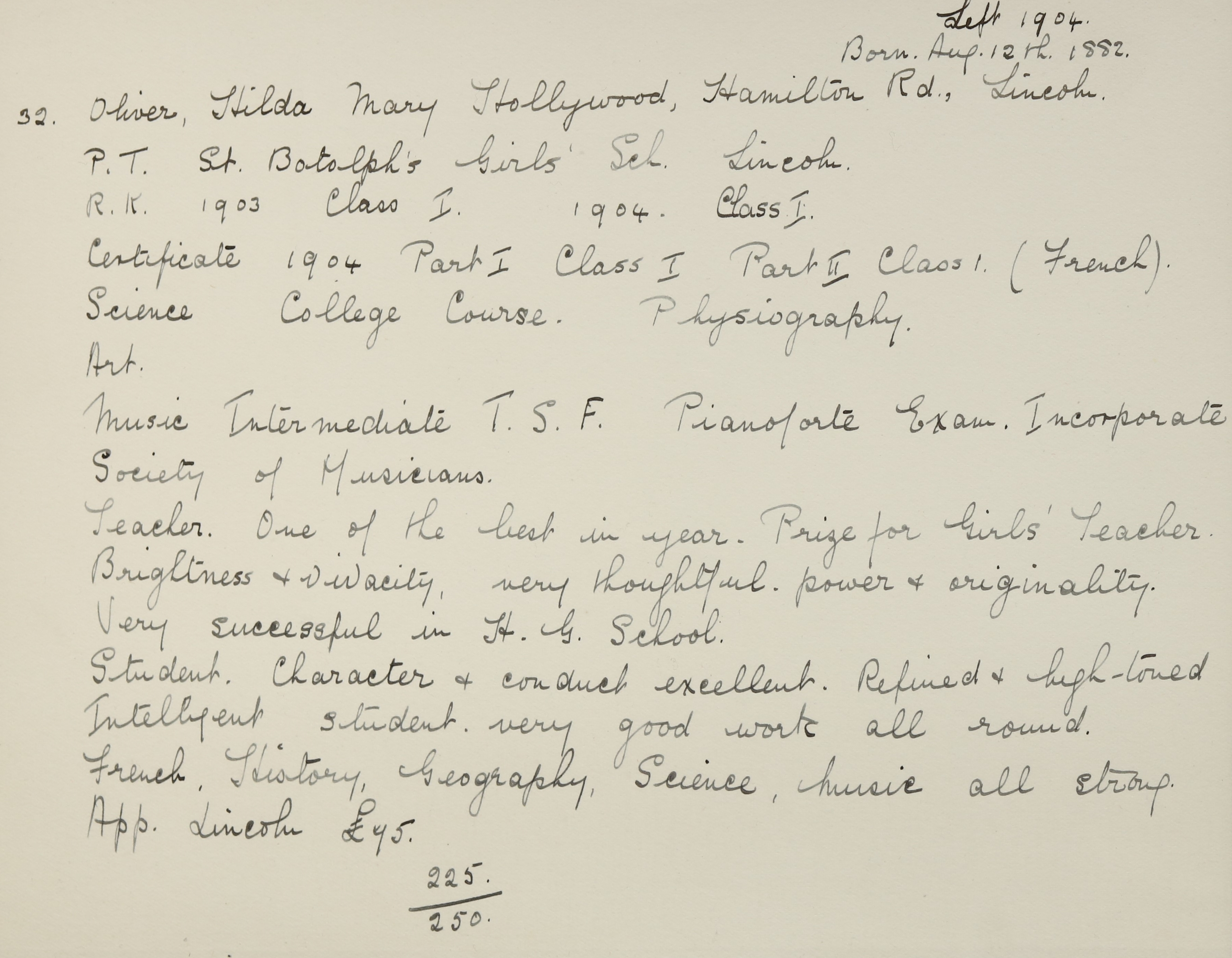 She is at Hollywood, Hamilton Road, Lincoln. Her father is listed as ‘Secretary Limited Co’. Hilda is listed as ‘Pupil Teacher’. Her mother and brother, Harry, are unlisted. There is a servant, Clara Blow (b. 1885).