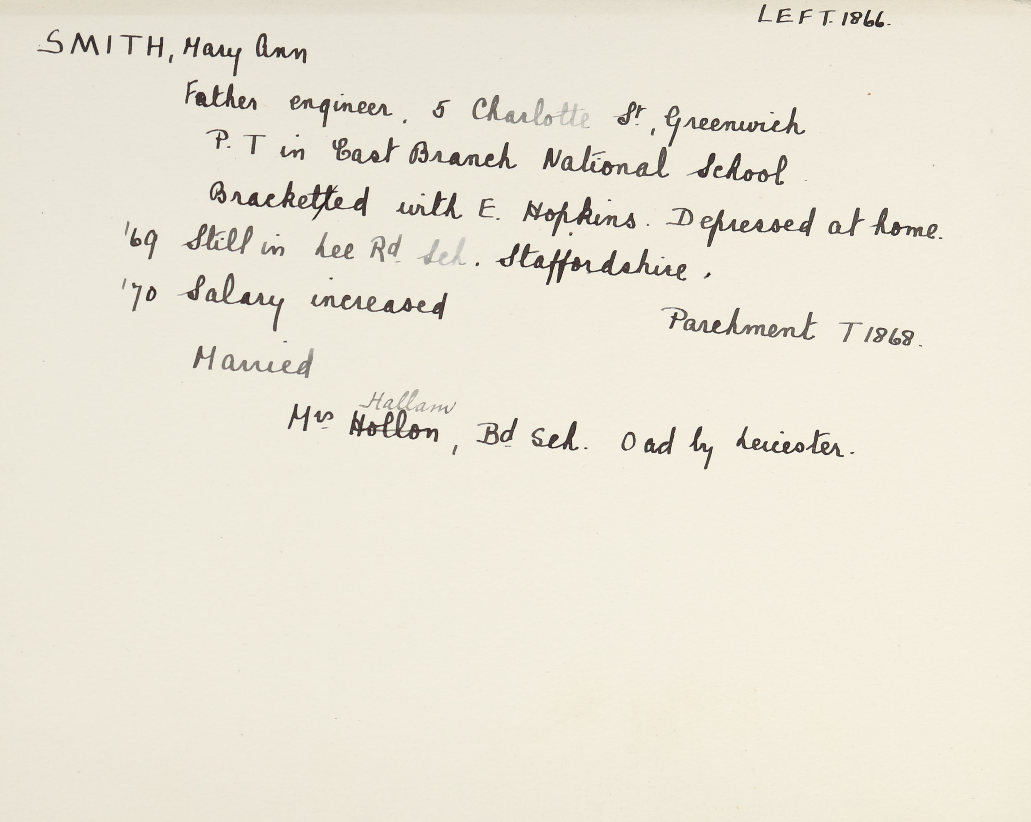 She is at London Road, North Side, Oadby. Her father-in-law, John Hallam (b. 1818), is listed as ‘Saddler and Pensioner’. Her mother-in-law, Sarah Hallam (b. 1820), her husband and her sister-in-law, Elizabeth Hallam (b. 1861), are unlisted. Mary is listed as ‘Schoolmistress’. Her sister-in-law, Kate Hallam (b. 1857), is listed as ‘Machine Hand’.