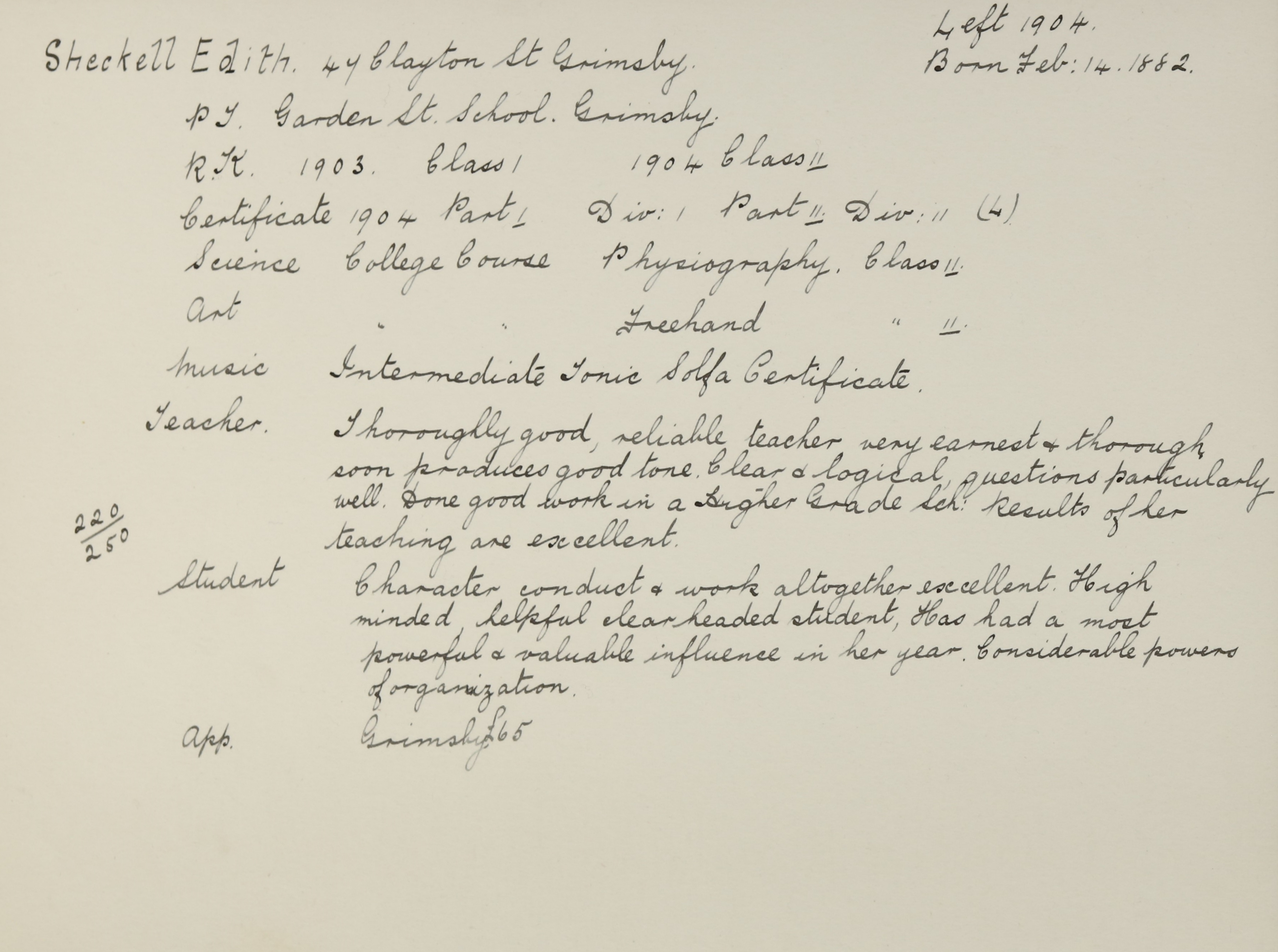 Family is listed as ‘Shickell’. Her mother is listed as a widow and ‘Grocer’. Her sister, Minnie, is listed as ‘Dressmaker’. Her sister, Annie, is listed as ‘Grocers Assistant’. Her brother, John and Nathaniel, are listed as ‘Pupil Teacher’. Edith and her siblings (Henry, Elsie and Sidney) are unlisted. There is a boarder, James E Jubb (b. 1871), listed as ‘School Masters Assistant’.