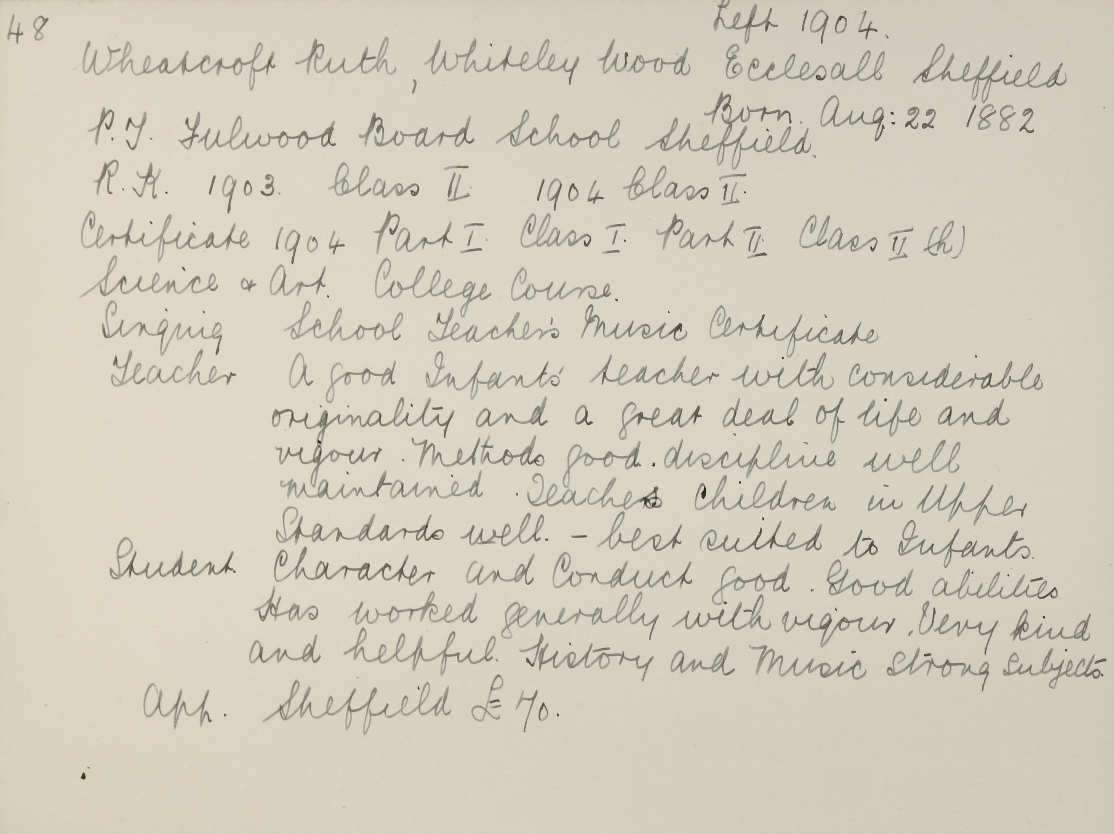 She is at Brookhouse Hill, Sheffield. Ruth is listed as ‘School Teacher’.
