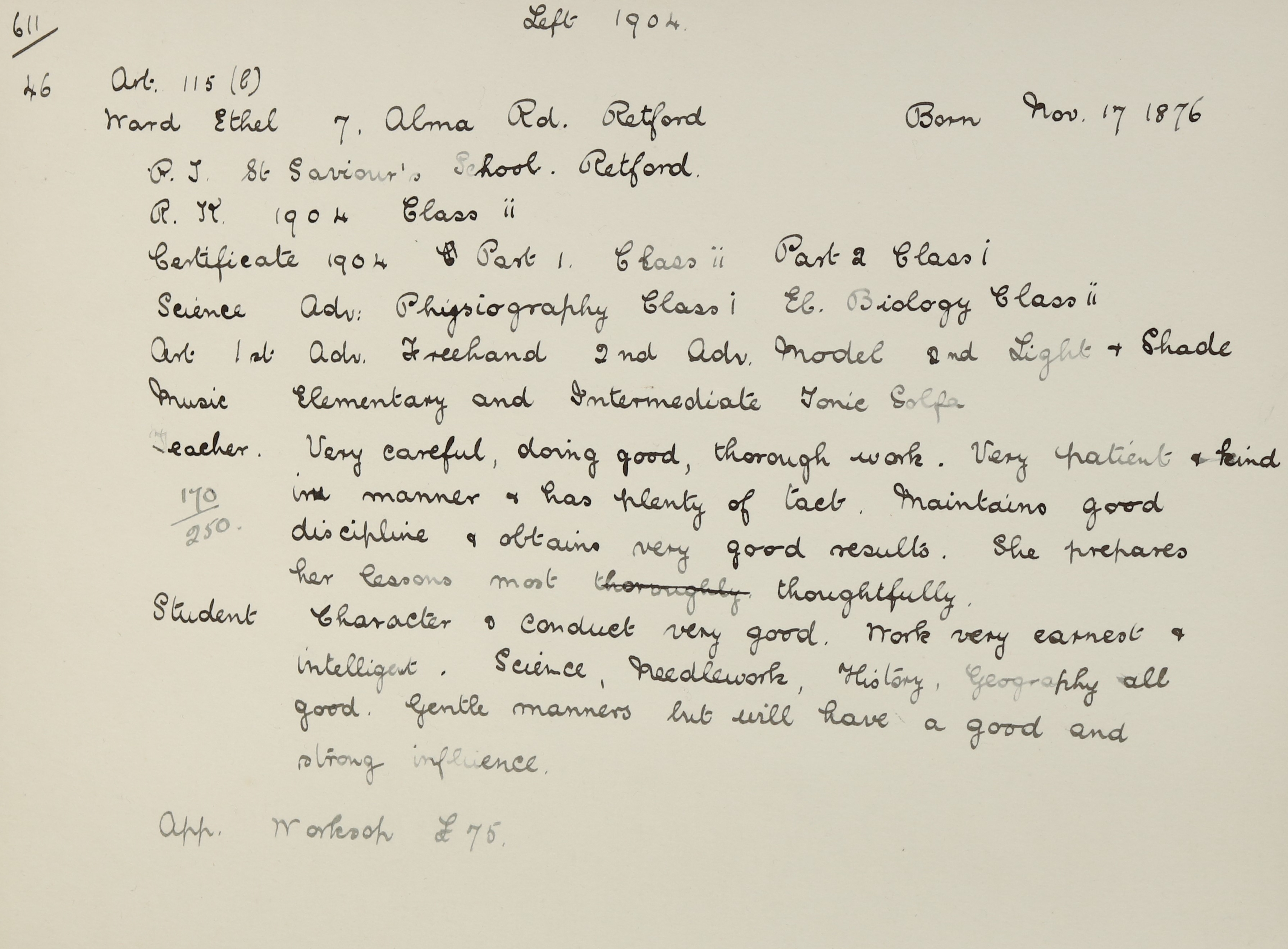 She is at 4 Alma Road, Retford. Her father is listed as ‘Commercial Clerk’. Her mother is listed as ‘Head Teacher’. Ethel is listed as ‘Assistant Teacher’. Her brother, Cecil, is listed as ‘Draughtsman’. Her sister, Elsie, is listed as ‘Student’.