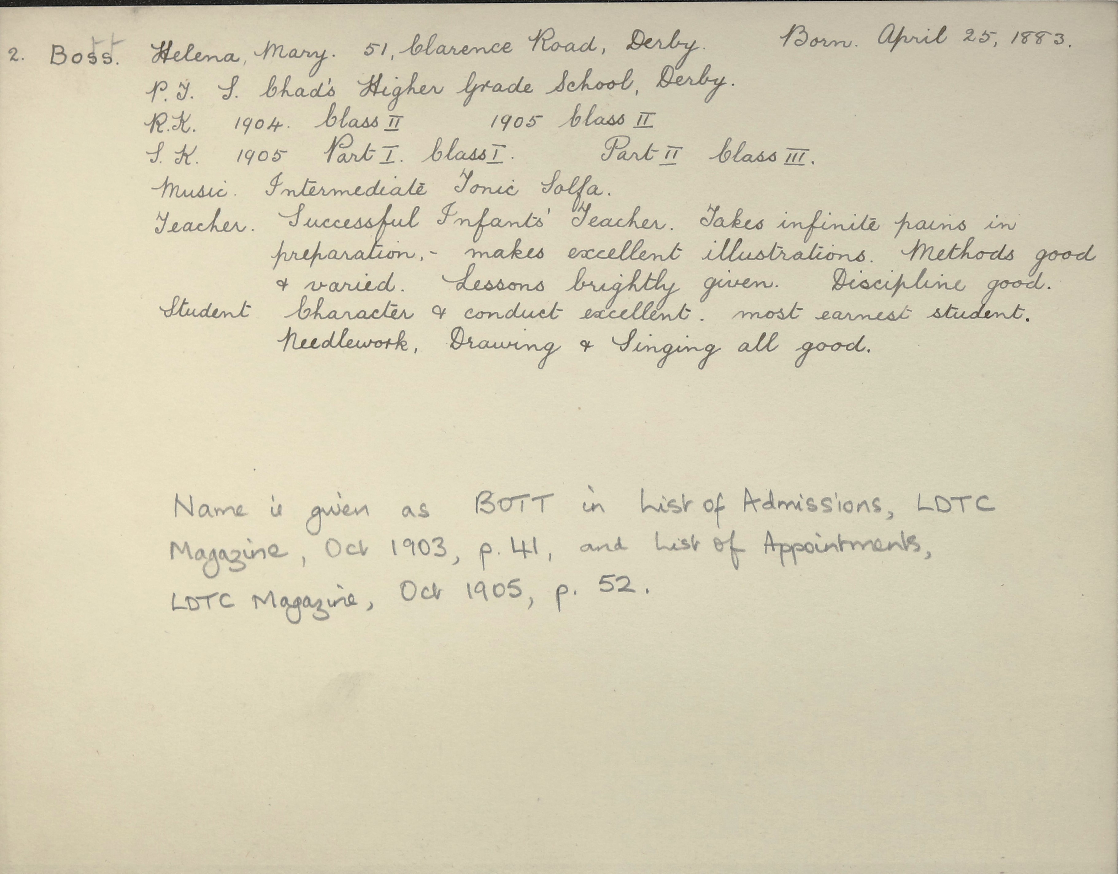 BOTT, Helena Mary of 38 Fairfield Road, Derby, spinster died 06 July 1962 at Derbyshire Royal Infirmary, Derby. Probate London 20 August to Charles Southern, solicitors managing clerk and Stanley Norman Gilbert, solicitors’ clerk. Effects £3955, 14s, 2d.