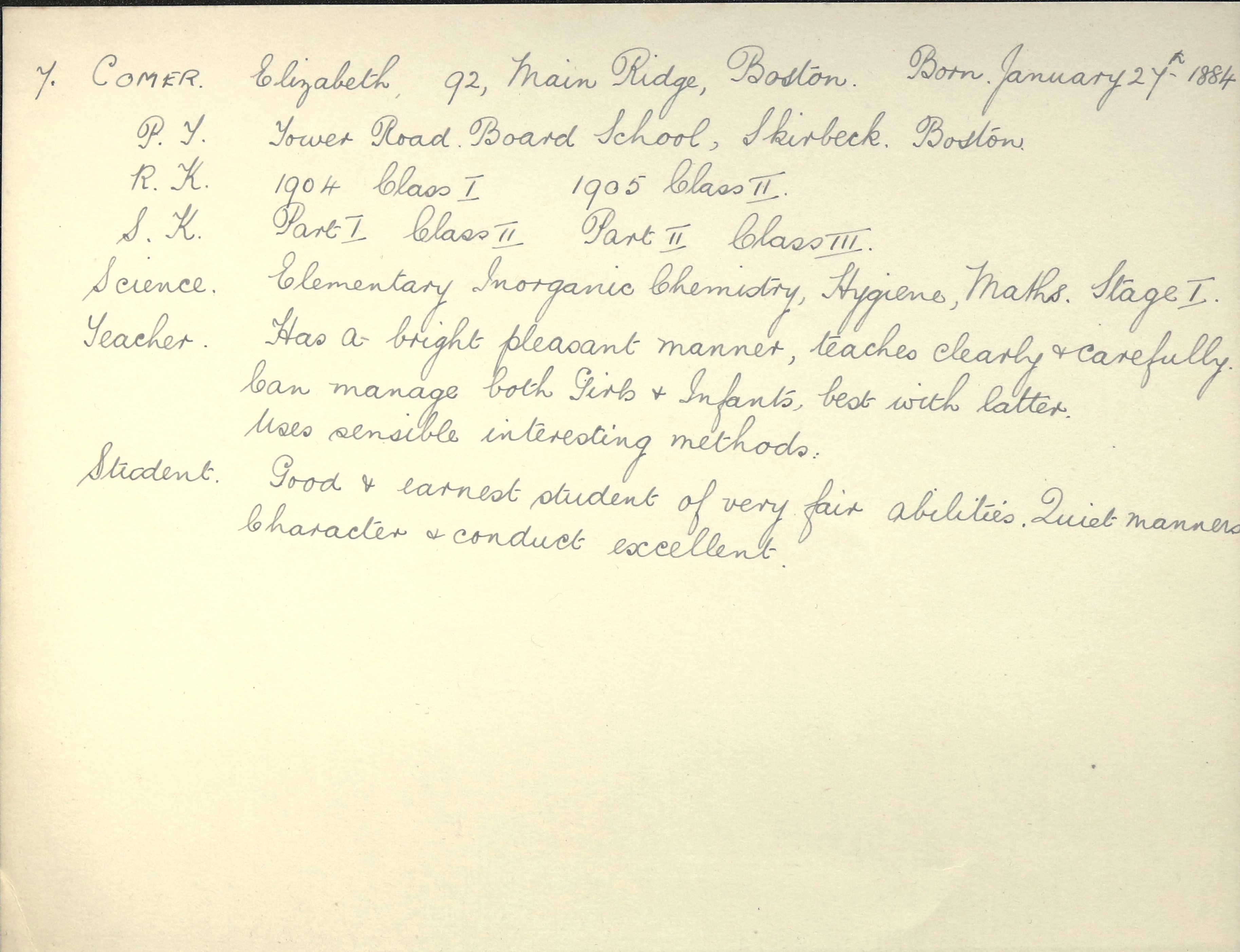 She is at 92 Main Ridge, Boston. Her father is listed as ‘Builder’s Foreman Joiner’s Shop’. Her mother and brother, Thomas, are unlisted. Elizabeth is listed as ‘(Board School) Pupil Teacher’.