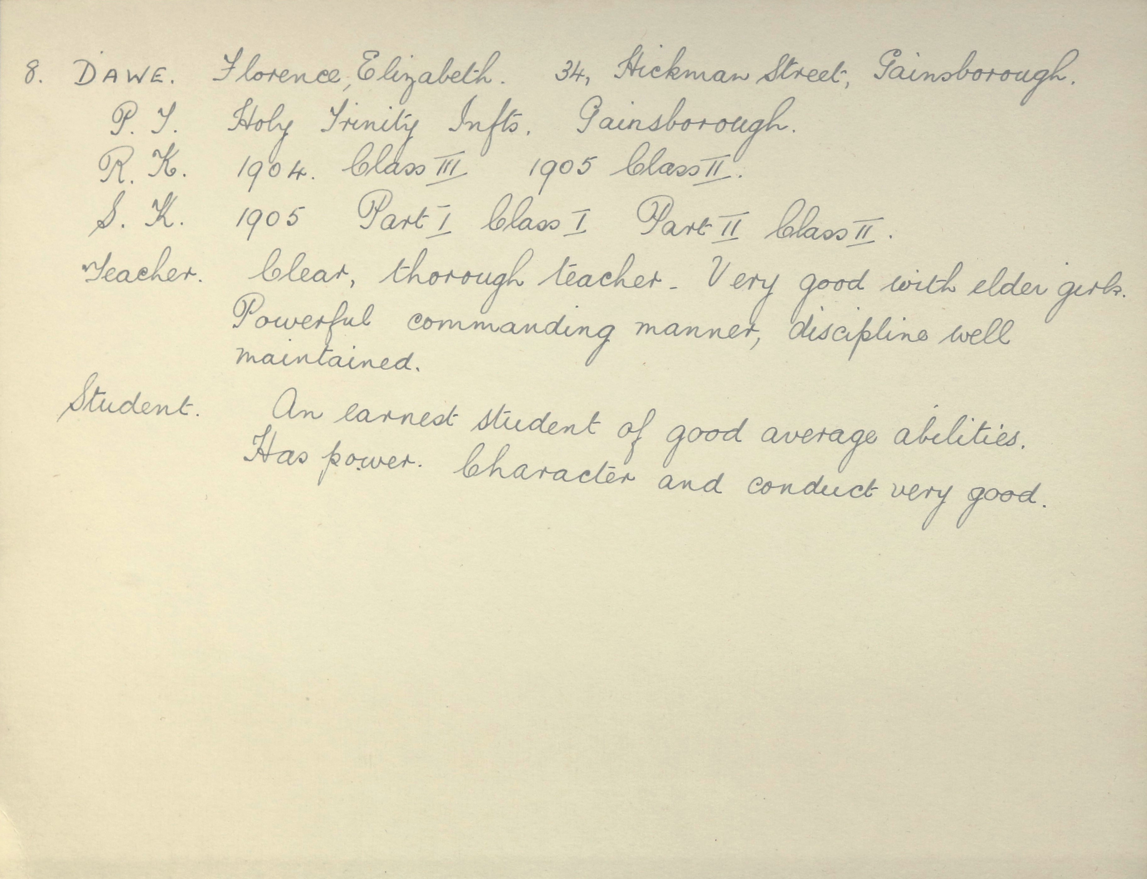 She is at the Wesleyan School, 34 Hickman Street, Gainsborough. Her father is listed as widower and ‘Coal Porter’. Her sister, Mary, is listed as ‘Housekeeper’. Her sister, Alice and Edith, are listed as ‘Dressmaker’. Her brother, Arthur, is listed as ‘Mechanical Engineer’s Clerk’. Florence is listed as ‘Pupil Teacher’.