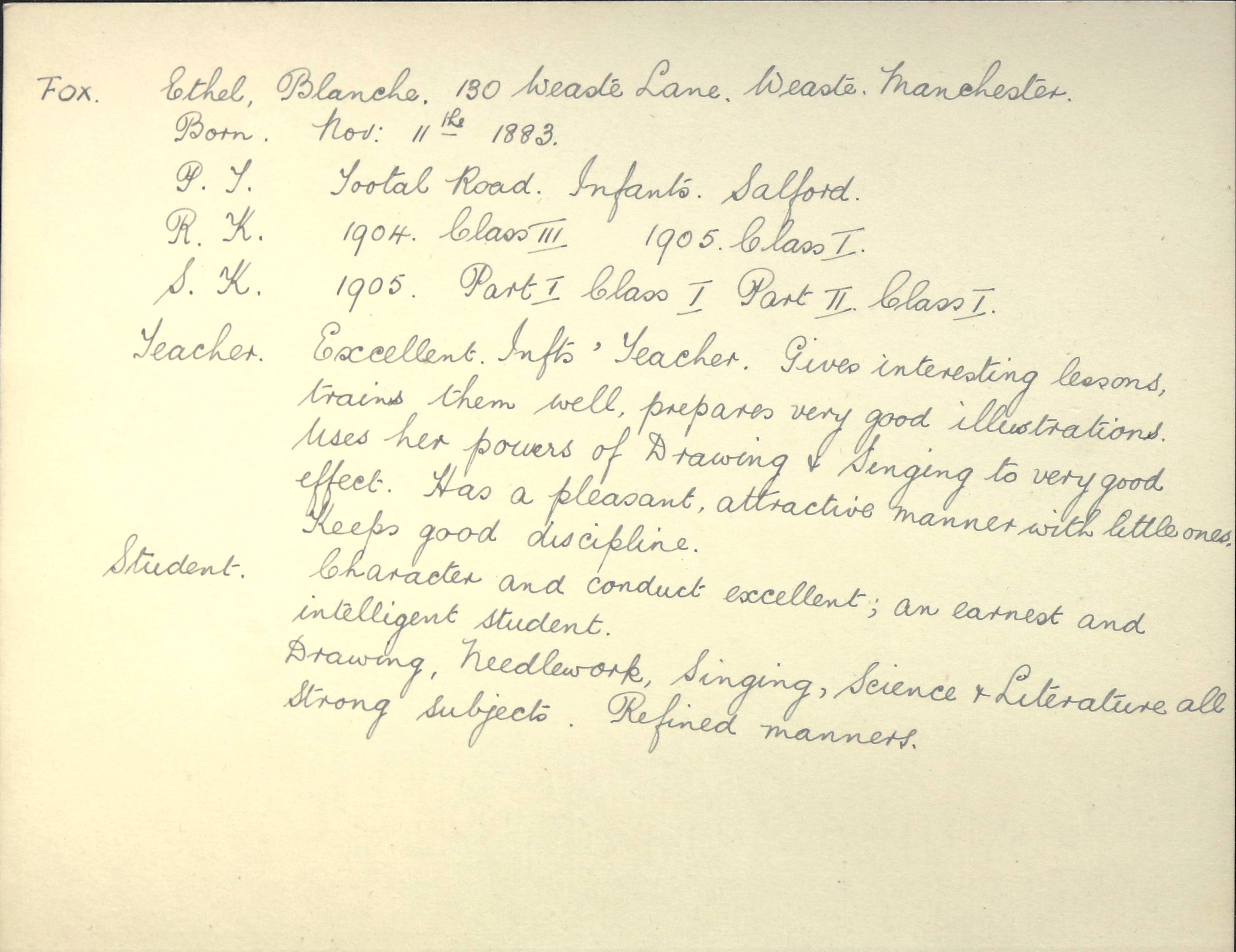 She is at 142 Weaste Lane, Pendleton, Salford. Her father is listed as ‘Railway Goods Inspector’. Her mother and sister, Winifred, are unlisted. Her sister, Clarice, is listed as ‘Photographic Artist’. Ethel is listed as ‘School Teacher’.