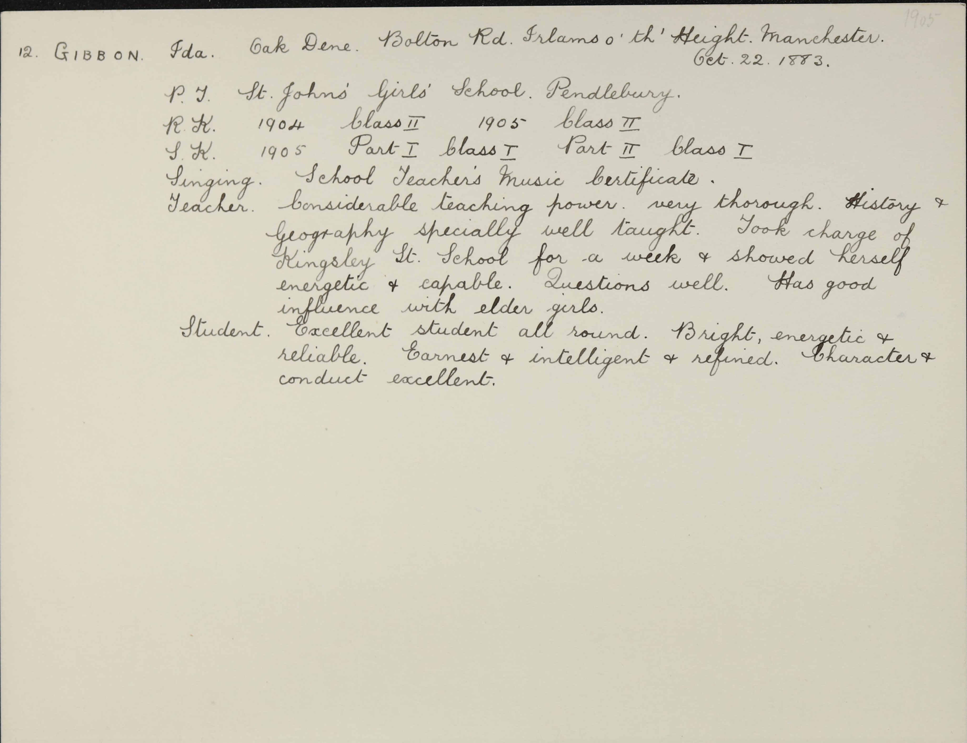 She is at Oak Dene, Bolton Dene, Pendleton. Her father is listed as ‘Linen Merchant’. Her mother and sister, Eva, are unlisted. Ida is listed as ‘Pupil Teacher’. There is a servant, Elizabeth Eva Brooks (b. 1875).
