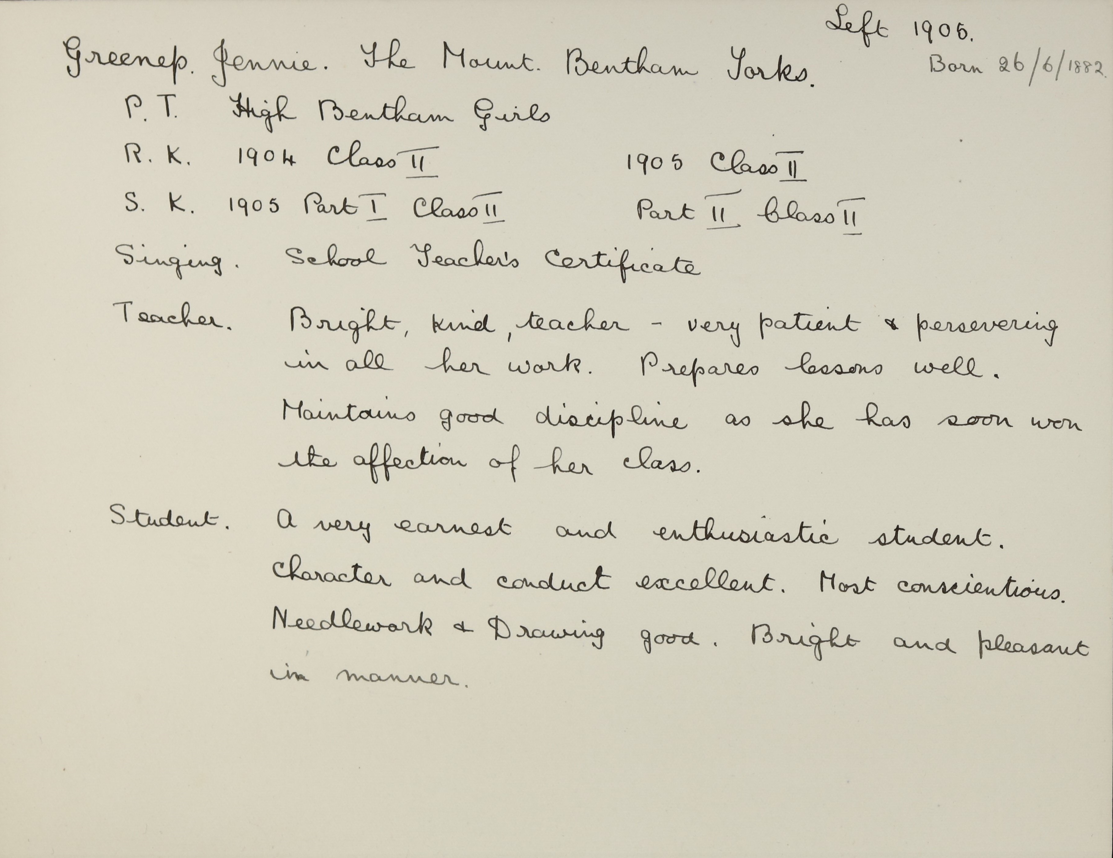 She is at The Mount, Bentham. Her father is listed as ‘Ironmonger’. Her brother, William, is listed as ‘Plumber and Decorator’. Her brother, John, is listed as ‘Plumbers Apprentice’. Her Sister, Alice, is listed as ‘Confectioners Assistant’. Jennie is listed as ‘Assistant Teacher’. Her mother and siblings (Elsie, Norman, Fanny and Gilbert) are unlisted. there are two visitors, Eliza E Harrison (b. 1865) and Fanny H Harrison (b. 1867), listed as ‘Hosiers’.